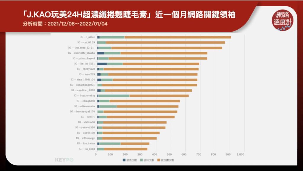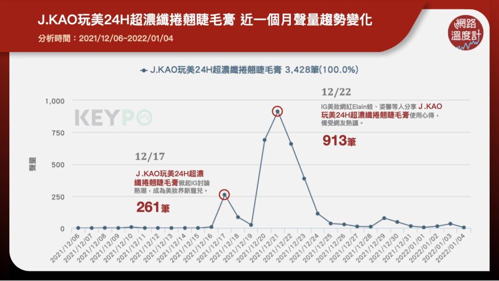 近年MIT品牌也備受網友矚目,DailyView網路溫度計透過《KEYPO大數據關鍵引擎》發現戲劇女神高宇蓁一手創立的「J.GAO」品牌日前推出「玩美24H超濃纖捲翹睫毛膏」,瞬間在IG掀起網友關注,成為美妝界新寵兒,隨後4位關鍵領袖的美妝網紅手刀分享使用心得、更帶起第二波討論熱潮,讓聲量攀上高峰。