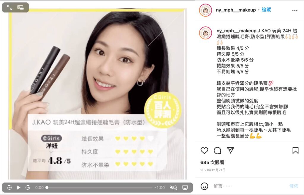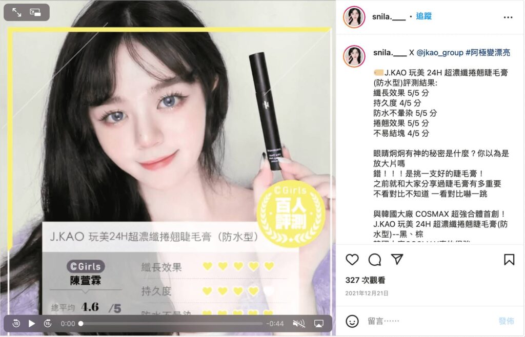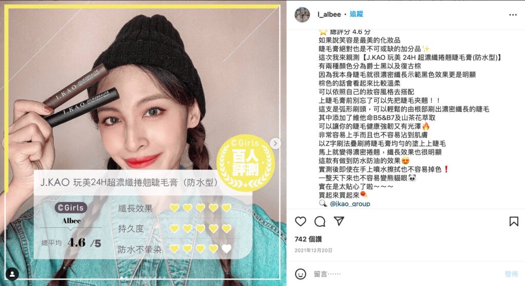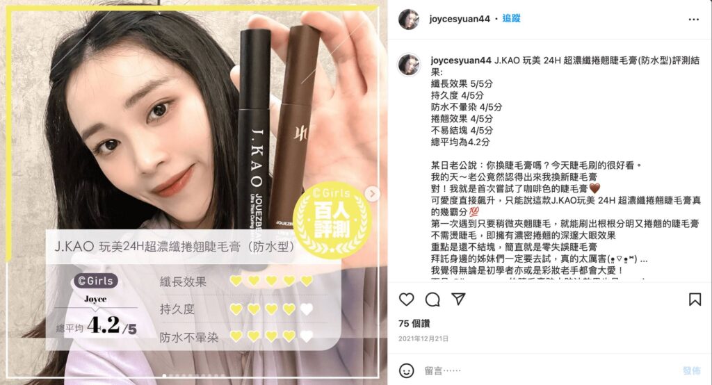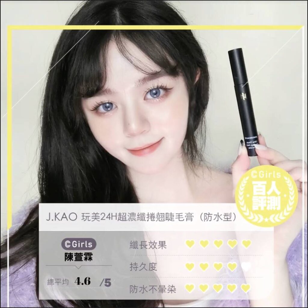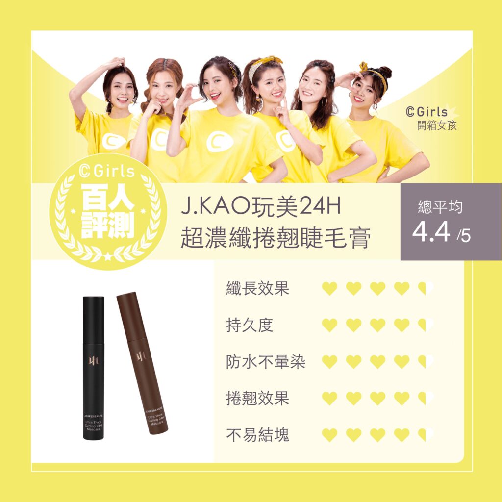 經過百位C.Girls親自評測分享結果,包含纖長效果、持久度、防水不暈染、捲翹效果、不易結塊共5項評分指標,J.GAO「玩美24H超濃纖捲翹睫毛膏」在滿分5分中榮獲4.4分評價,也掀起網友IG討論熱潮,心動不如馬上行動,美妝控們趕快趁優惠手刀搶購吧!