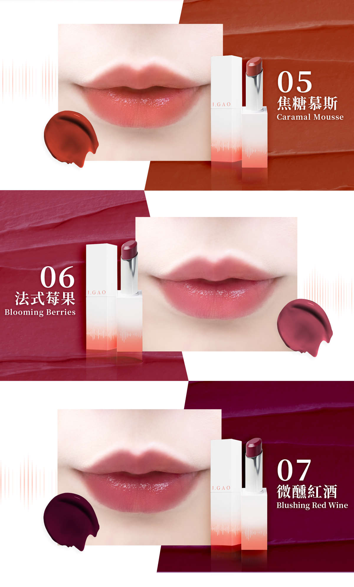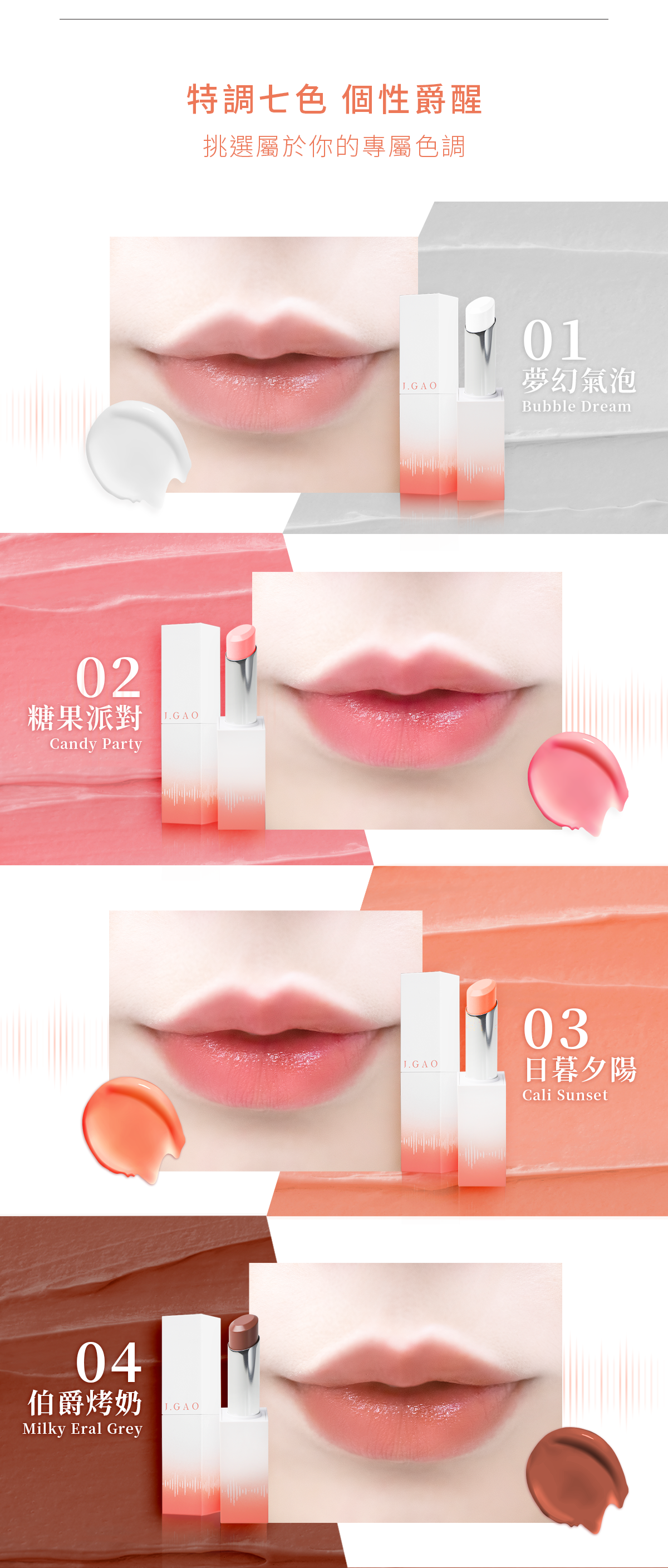 - 色 號 : 01夢幻氣泡、02糖果派對、03日暮夕陽、04伯爵烤奶、05焦糖慕斯、06法式莓果、07微醺紅酒